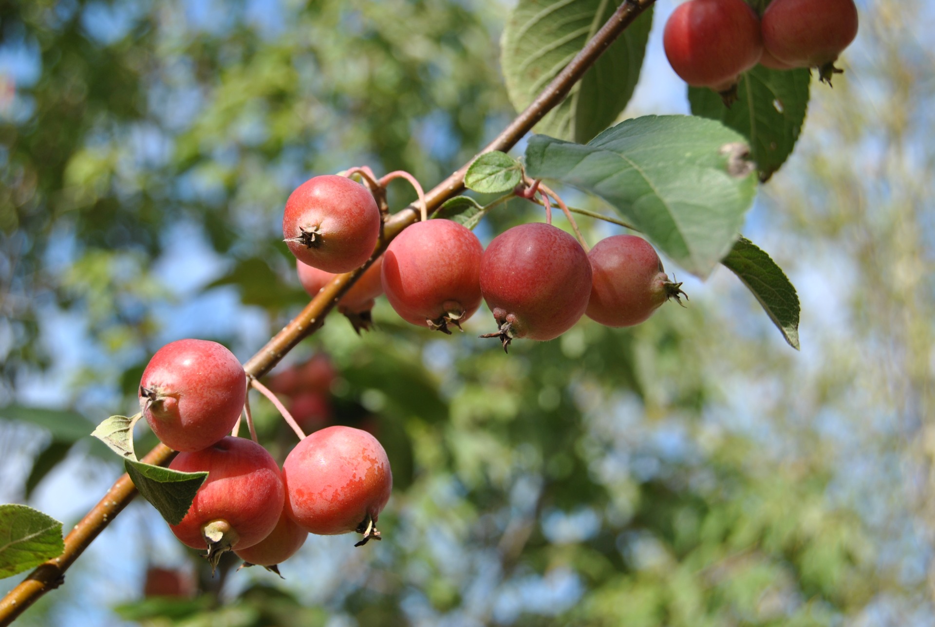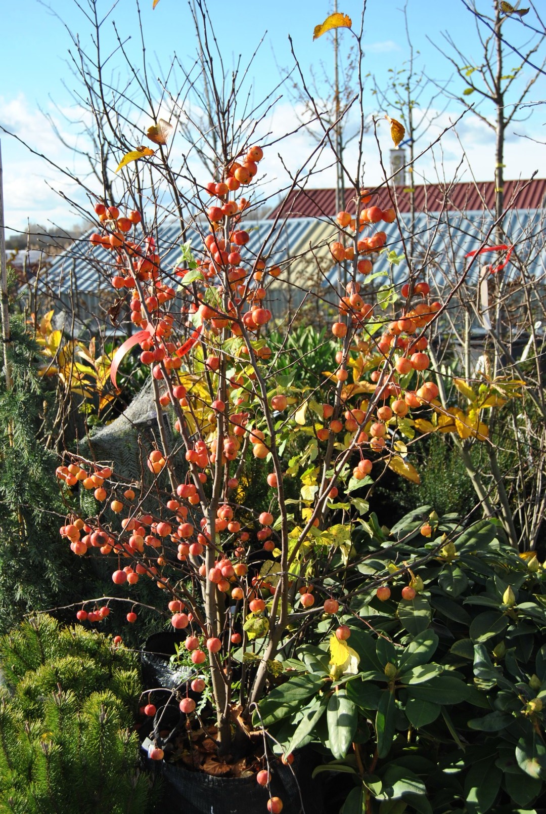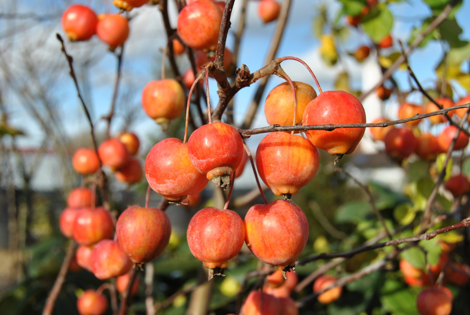 Plody: Oranžovo-červené, guľaté, malé (2–3 cm), vytrvávajú na strome až do zimy